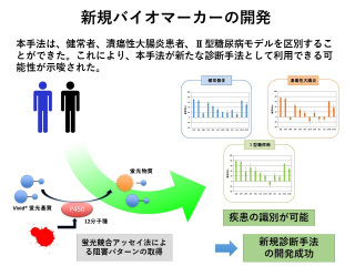 ■ 研究シーズ- 疾患診断用バイオマーカーシーズカテゴリ:ライフサイエンス研究キーワード:バイオマーカー, リキッドバイオプシー研究の背景と目的:近年、急速な高齢化を迎える我が国では、医療費の削減は緊急を要する課題となっています。そこで、各種疾患の早期診断は益々重要になってきた。本研究では、疾患の早期診断を目指したバイオマーカーの開発を目指しています。研究内容:生体内には、各種薬物を代謝するシトクロムP450酵素存在しています。また、これらの酵素群は、生体内薬物の85%もの代謝に関与するという試算もあります。最近の研究から、これらシトクロムP450酵素はがん、糖尿病、潰瘍性腸疾患などの発症に伴い、その酵素活性や酵素量が変化することが明らかとなっています。そこで本研究では、血中のP450代謝物量変化をモニターすることで病気の発症や、その進行状態が明らかになるのでは無いかと考えました。今回、これらのP450酵素による代謝産物の評価に対し、生体外で人工的に作製したヒト由来のP450酵素と蛍光基質との反応に対する血清成分による反応阻害を指標として評価することに成功しました。現在、これらP450阻害反応を指標に、潰瘍性大腸炎と糖尿病の診断用バイオマーカーの開発に成功しています。また、今後はより広範囲な疾患に対して本手法を適用することを予定しています。